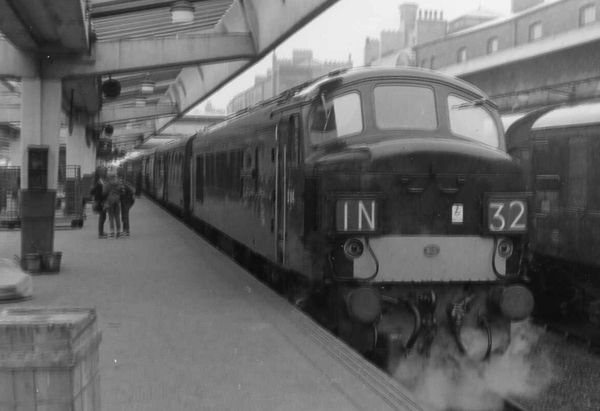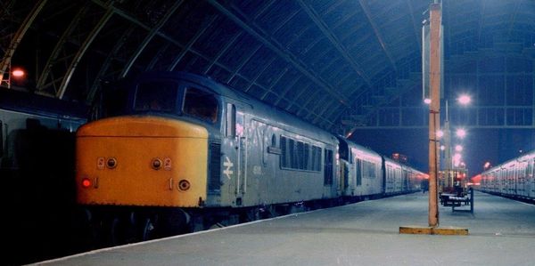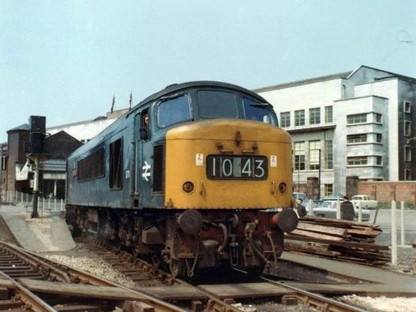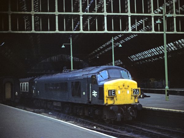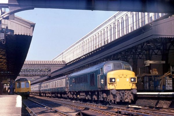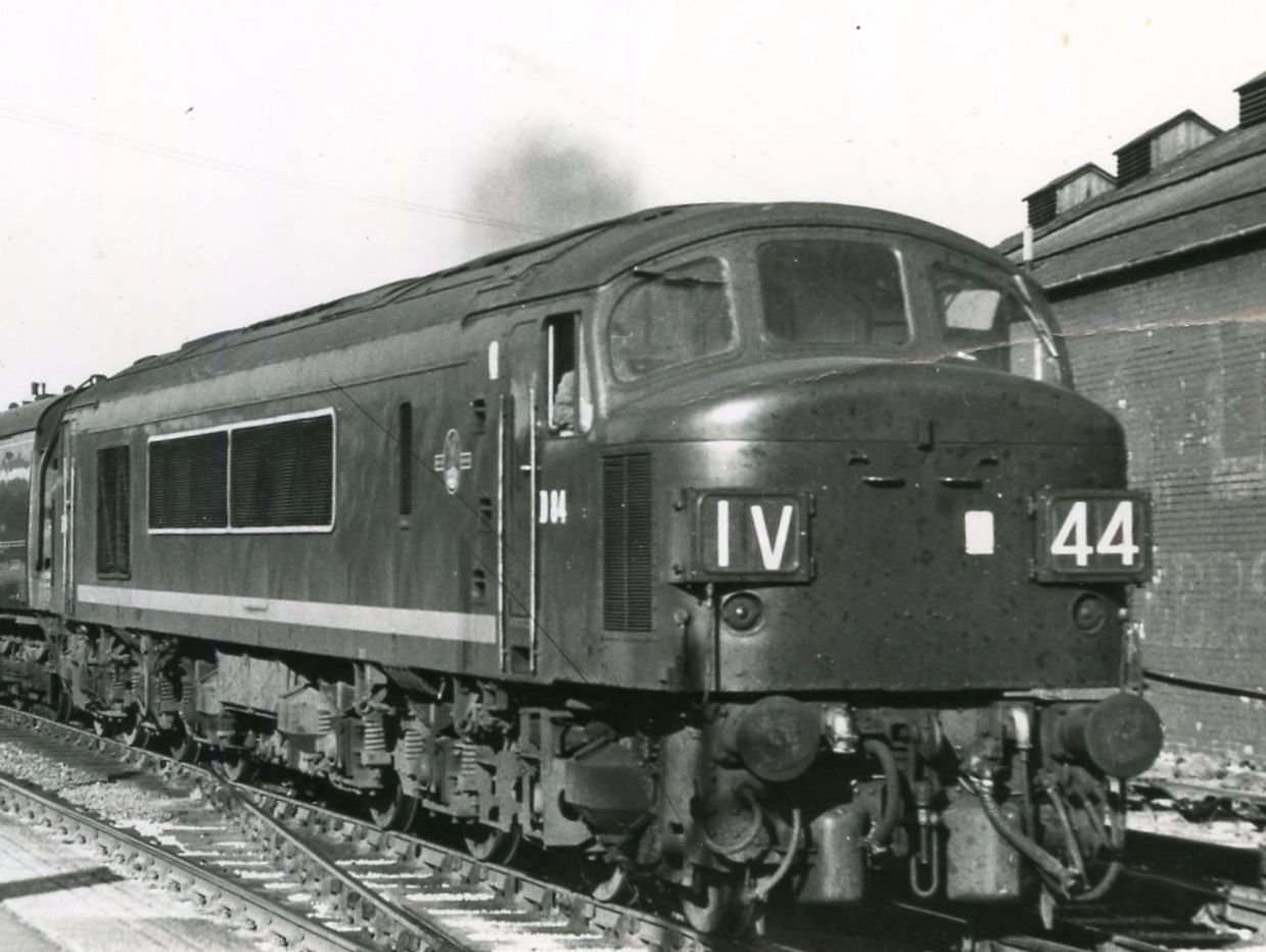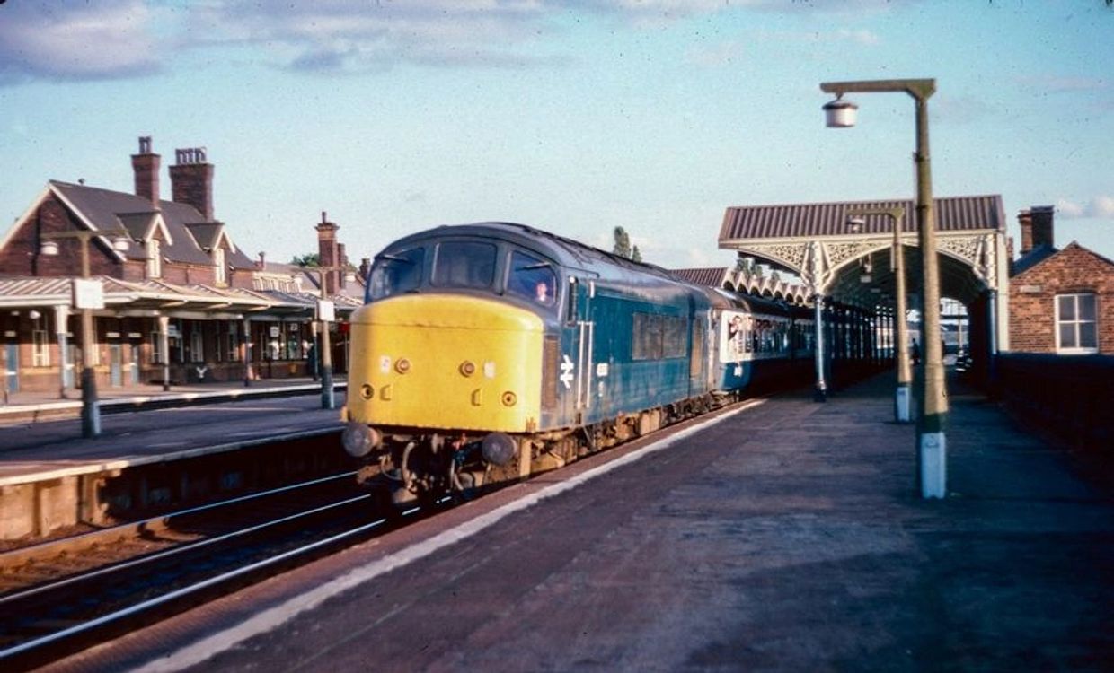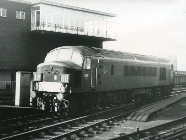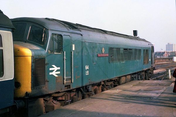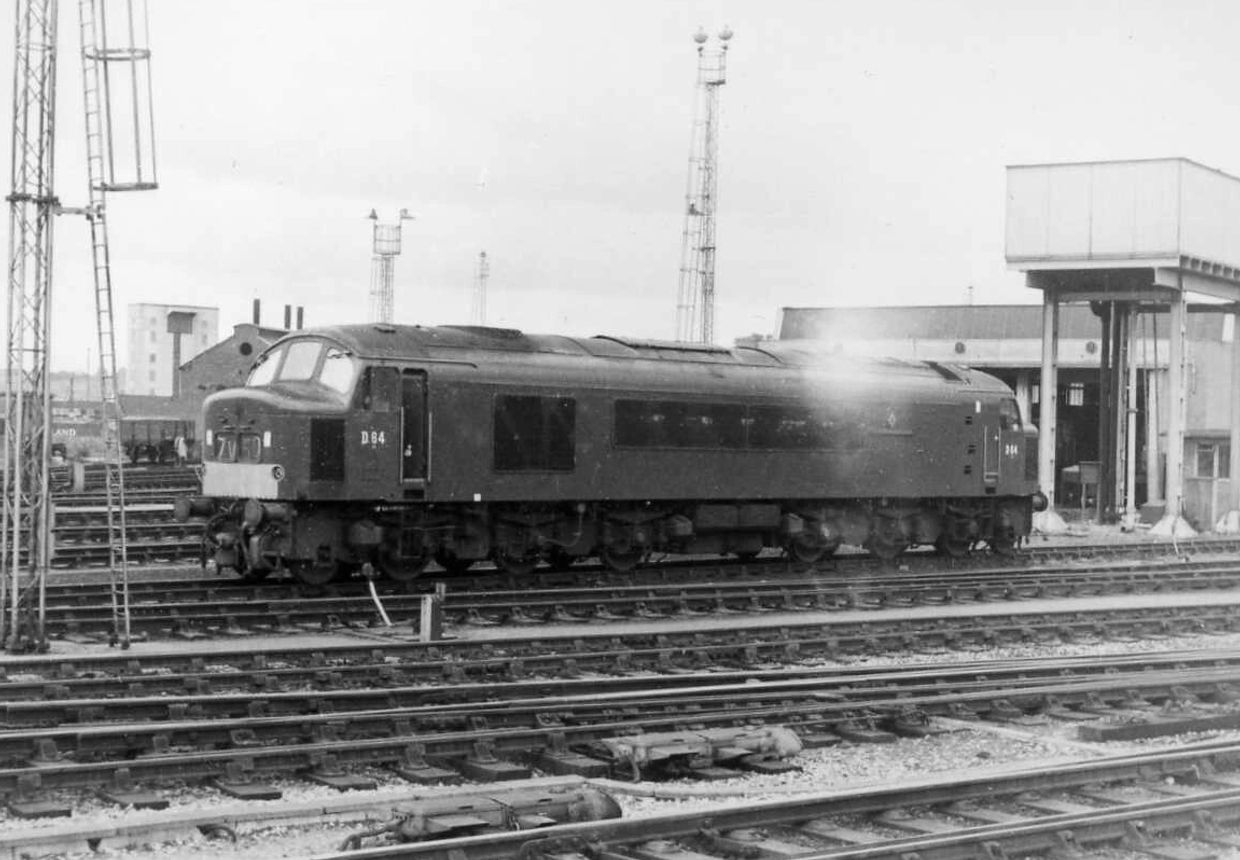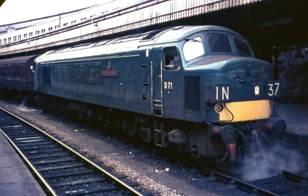 1970.  D71 THE STAFFORDSHIRE REGIMENT(PRINCE OF WALES'S) with converted No 1 end at Nottingham, after bringing in 1O43 0905 summer SO Leeds - Poole, which ran up the Midland Main Line in the early 1970's. The loco never lost the D prefix until becoming 45 049 and also note the red buffer beam.