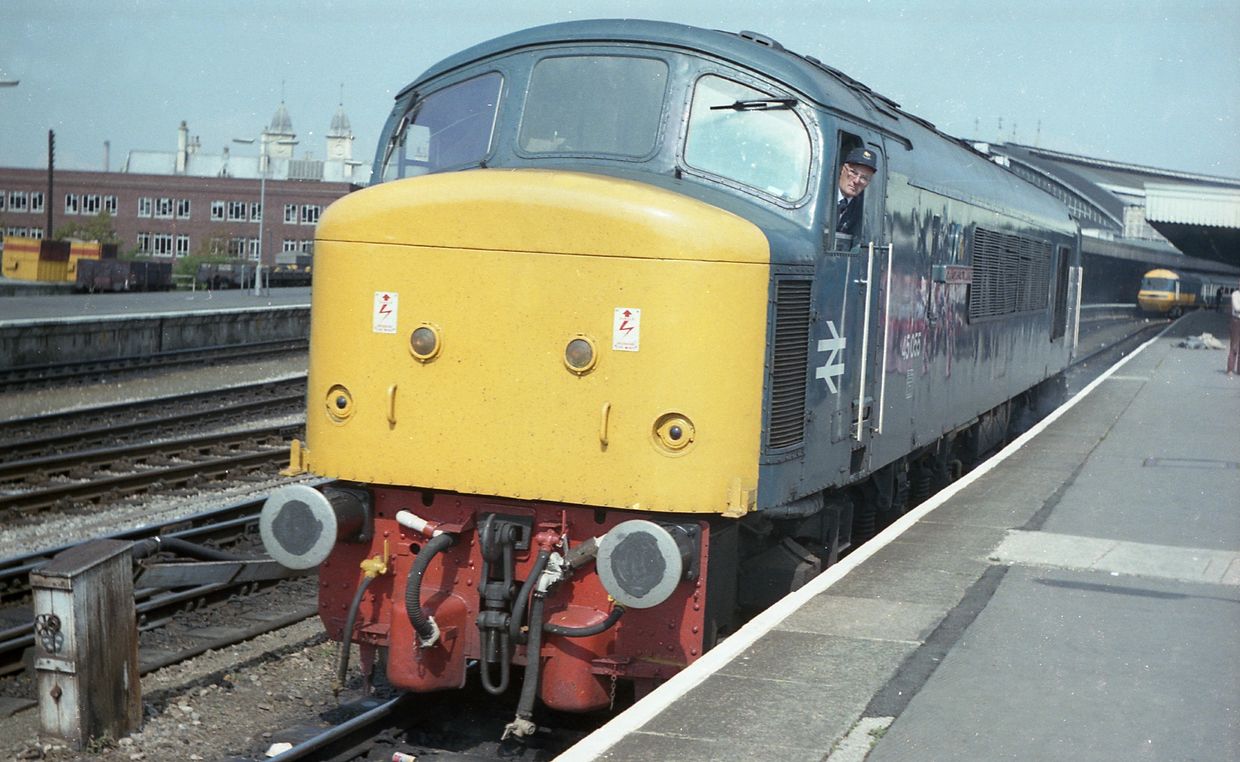 1982. Painted up for a special freight earlier in the month, in conjunction with the departure of the Armed Forces Task Force to liberate the Falkland Islands, 45 055 ROYAL CORPS OF TRANSPORT is seen light engine at Bristol Temple Meads on 28/08/1982. The loco is believed to have brought a Portsmouth bound train from Cardiff.