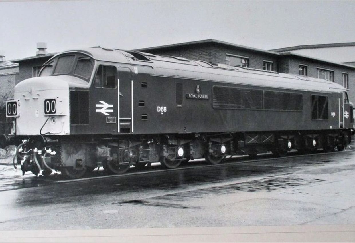 1967. D68 ROYAL FUSILIER, the first class 45 recipient of BR Blue Livery, at Derby Works early in 1967. The loco has just received its ROYAL FUSILIER nameplates, the last officially named Peak. However, the loco is still without tailight grabrails, has an unplated boiler grille and the long handrails that it was built with.