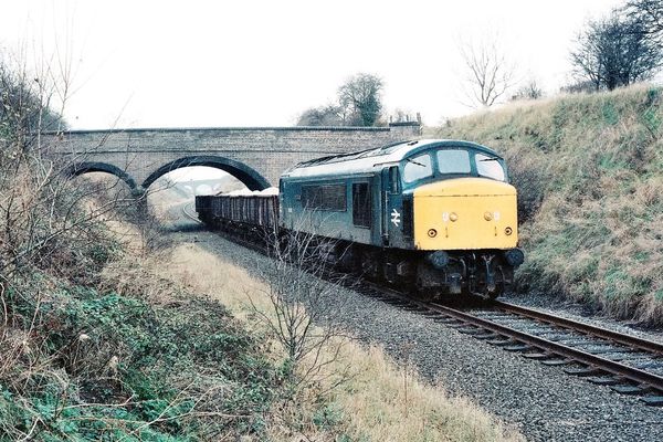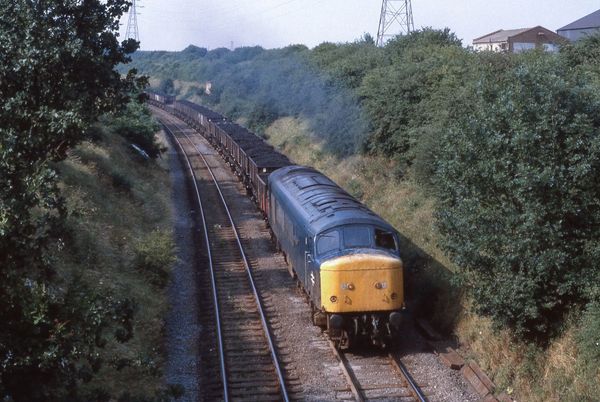 1982. 45 046 ROYAL FUSILIER working at full power upgrade towards Corby North Jn and the recently closed BSC Plant at Gretton Brook, at the head of a lengthy and heavy 8V26 Toton - Acton Yard coal service.