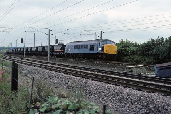 1980. 45 046 ROYAL FUSILIER heads northward on a loaded MGR, believed Betteshanger - Toton, train at Chiltern Green on 10/09/1980.