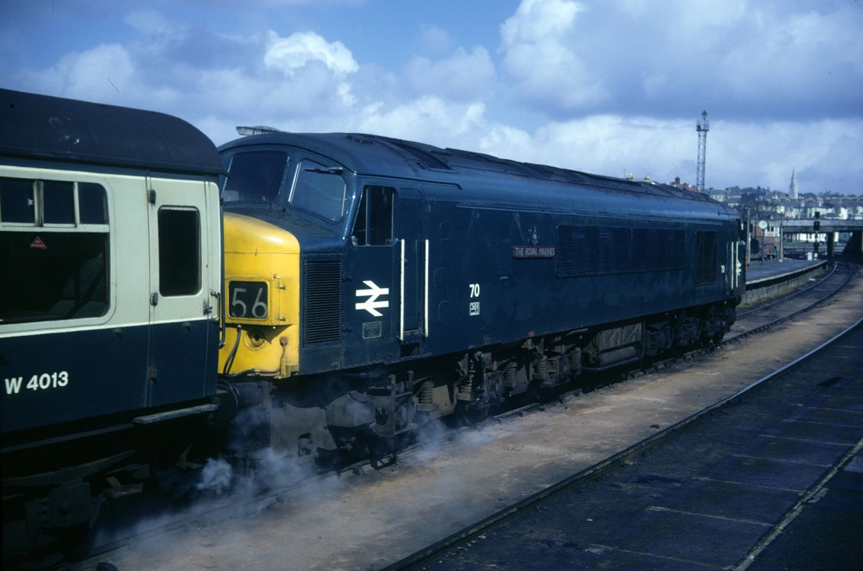 1973.  70 THE ROYAL MARINES prepares to depart from Plymouth with 1E21 1135 Penzance - Leeds on Sunday 25/03/1973.