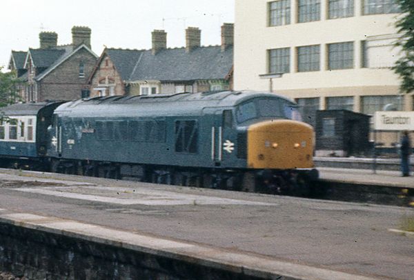 1976.  45 048 THE ROYAL MARINES arrives at Taunton hauling 1M28 1235 Paignton - Birmingham New Street on 29/05/1976. The loco has recently been fitted with the new marker lights, but without any bracketry, the first 45 to be fitted such.