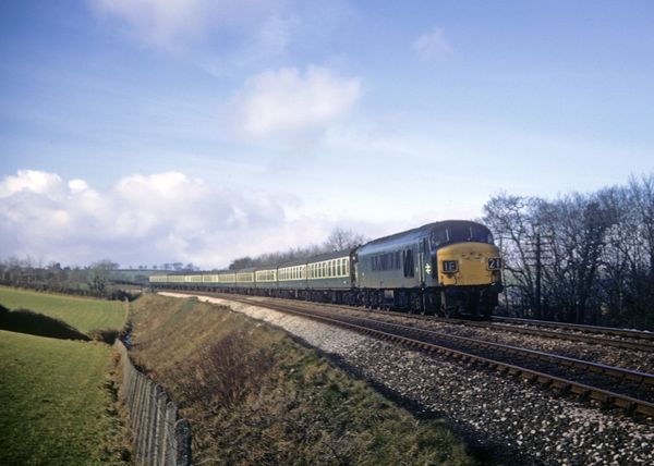 1973. 76 is working 1E21 1135 Penzance - Leeds near Moorswater in Cornwall on Sunday 18th February 1973. A classic view of the period by Roger Geach, please do not reproduce without permission.